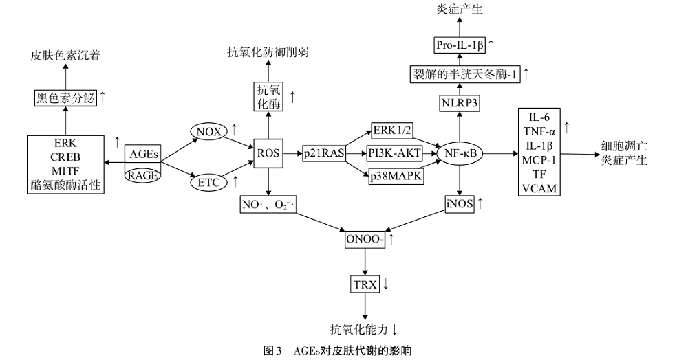 事实上,形成AGEs的通道主要有三种,包括糖化途径、多元醇途径和糖氧化途径,目前已经发现了约10种AGEs会对皮肤的不同结构有不同程度的影响,它们均能够集中的攻击胶原蛋白。此外,AGEs与RAGE之间的相互作用还会导致机体抗氧化防御减弱、抗氧化能力下降以及炎症的发生[9]。
