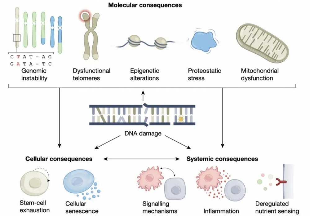 核基因组和线粒体基因组会不断受到外源性因素(如紫外线、X射线、食物、水和空气中的化合物)、内源性因素(如活性氧簇、醛类和晚期糖基化终末产物以及自发反应)的破坏。随时间发生的DNA损伤累对分子的影响主要以下有两种: