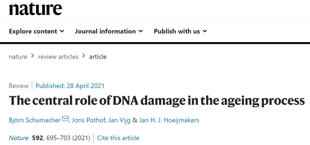 2021年4月,德国科隆大学衰老与疾病基因组稳定性研究所Björn Schumacher团队在《自然》杂志上发表题为《DNA损伤在衰老过程中的核心作用(The central role of DNA damage in the ageing process)》的综述文章,其详细介绍了DNA损伤与衰老表型的机制联系,并论述了DNA损伤在衰老过程中发挥的核心作用[15]。