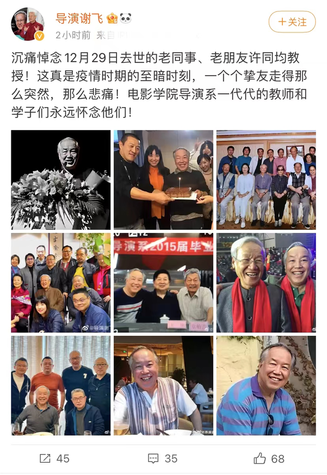 在得知许同均先生离世的噩耗之后,他的同事、同行和学生纷纷发文悼念,以表达哀痛之情。大导谢飞连续发布多篇文字来缅怀好友,他表示,在近一段时间,目睹着一位位挚友突然离世,令他深感悲痛,并代表电影学院的教师和学生缅怀这些影圈前辈。从谢飞导演分享的诸多合影中,不难看出他对这位老同事和多年好友的不舍和痛惜。