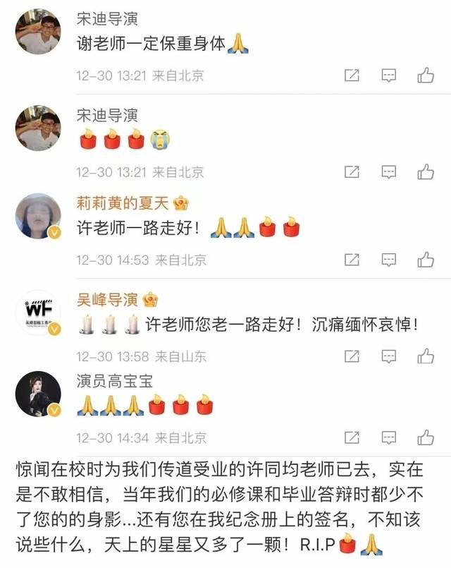 另有一些年轻导演和演员也在线上表达哀思。导演田凯在平台上表达了他的悼念之情,同时表示他会珍惜许同均先生赠予的书籍。还有导演陈国星不仅亲自前往现场进行悼念,也在线表达了他的缅怀之情。另有一些年轻导演和演员也在评论区表达了悼念之情,其中包括宋迪、吴峰和高宝宝等人。尽管他们言语表达十分简单,却能感受他们对于前辈离世的惋惜和哀痛。