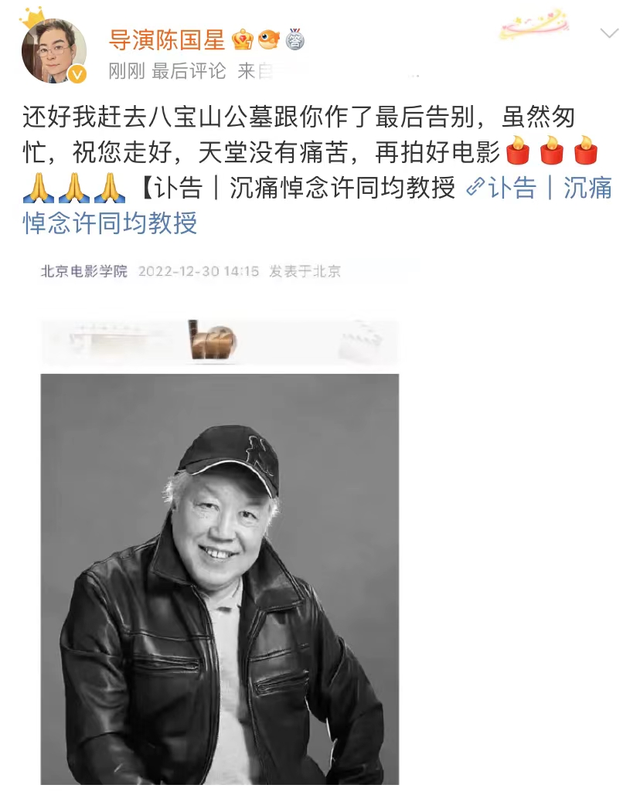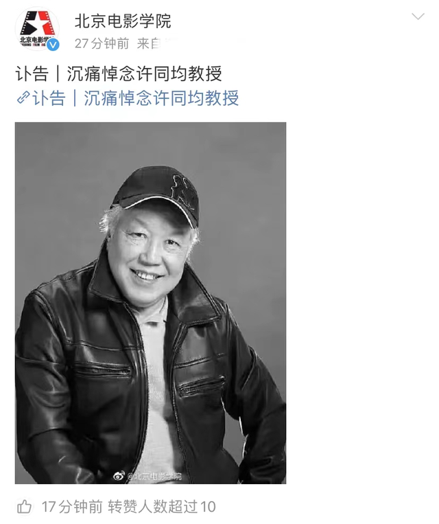 最近一段时间,影视圈频频传出令人悲痛的消息,让广大网友为之痛惜。30日,北京电影学院在官方平台发布讣告:著名电影、电视剧导演、北京电影学院导演系教授许同均先生于2022年12月20日因病逝世,享年76岁。