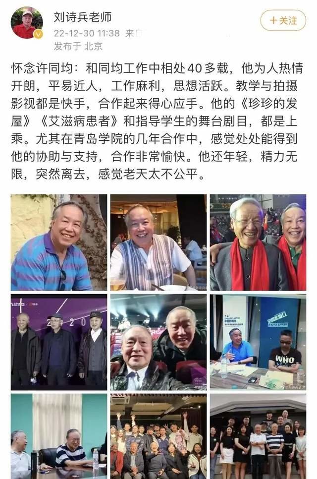 还有导演刘诗兵在线哀悼老同事,他在文中盛赞许同均先生为人热情活跃,既是令人尊敬的好友,同时也是令人钦佩的合作伙伴。对于对方的离世,刘诗兵先生感到十分遗憾,认为许同均先生仍然可以继续为中国电影做出贡献,无奈突然离世。