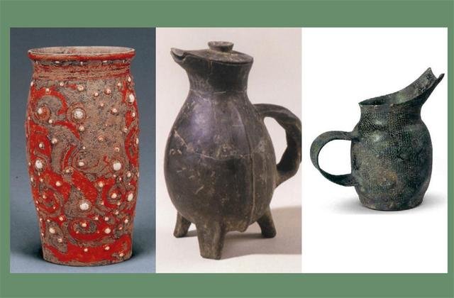 精美的漆器上镶嵌着玉器,发达的黑陶(中、右)