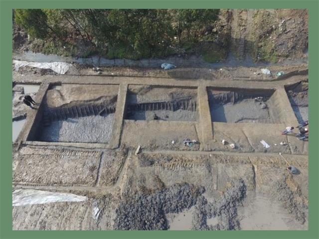 良渚古城城内发现的古河道钟家港加起来大约30公里长,有8个水城门,只有南边一个是陆地城门。经过几年的发掘,在钟家港古河道里,发现当年良渚人制作的护岸所用的木头粗细和间距都是一样的,这是一个非常标准化的工程。
