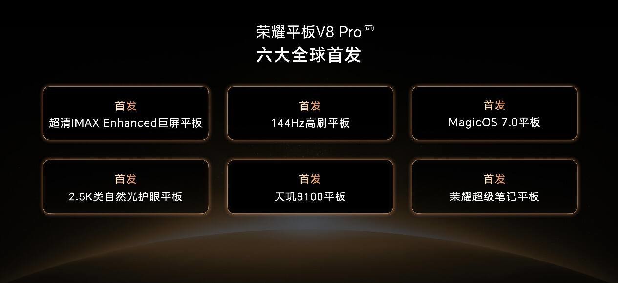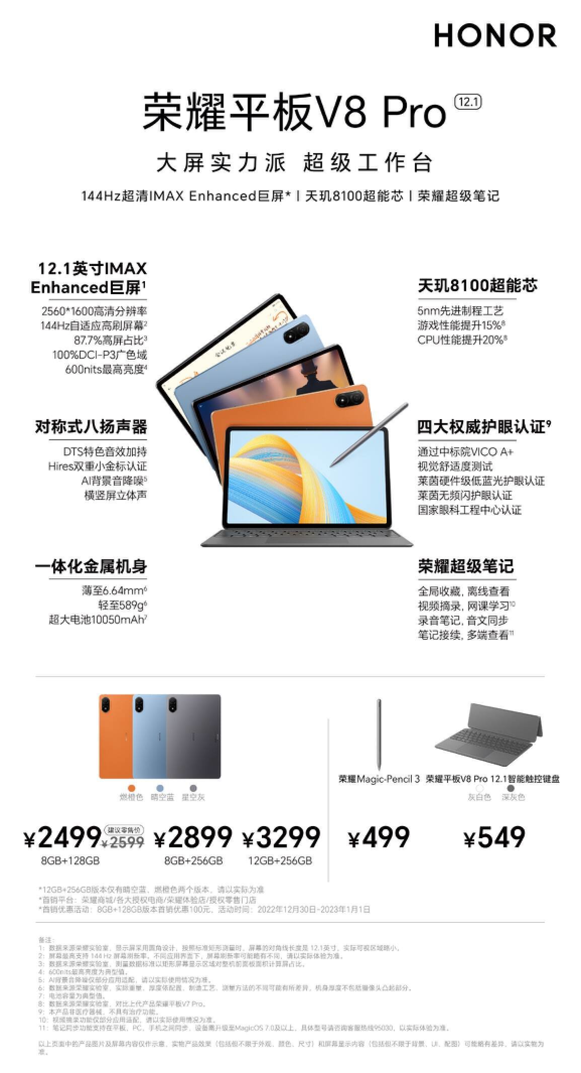 荣耀平板V8 Pro的荣耀笔记还有许多实用功能,等待大家在实际使用中一一探索发现。此外,荣耀平板V8 Pro还集首发超清IMAX Enhanced巨屏认证、首款支持144Hz自适应高刷屏幕、首款搭载MagicOS 7.0全场景操作系统、首个2.5K类自然光护眼屏和平板首发天玑8100于一体,无论硬件性能还是软件生态,都可以为大家带来前所未有的平板体验。