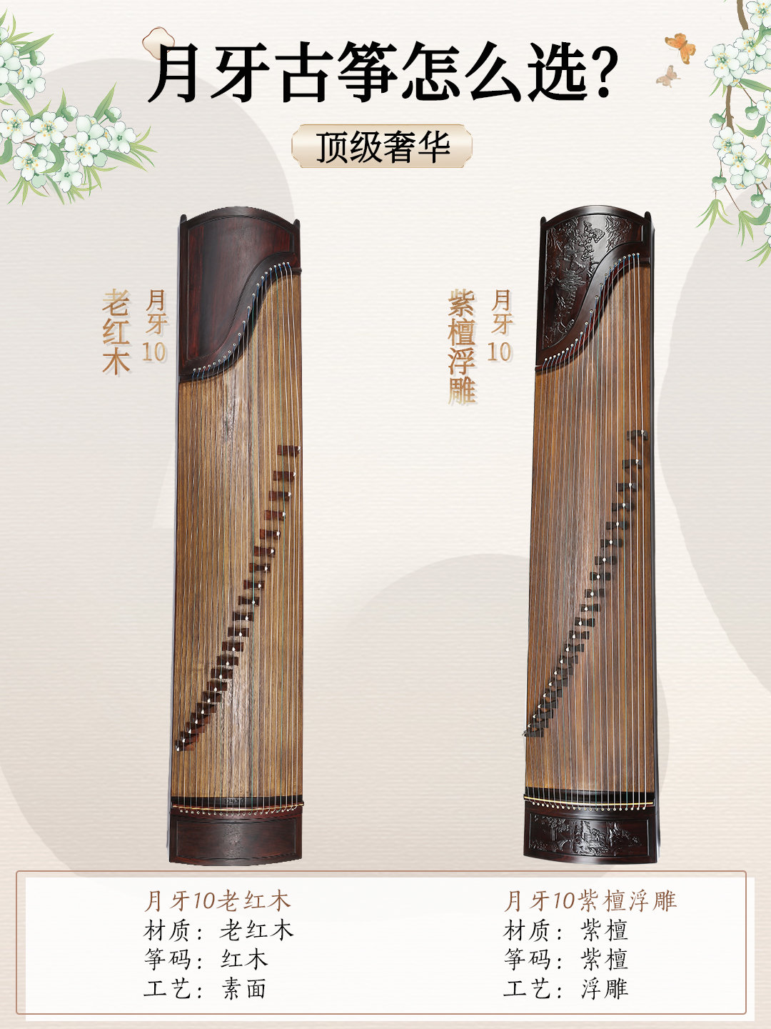 月牙10老红木和月牙10紫檀浮雕,这可是月牙古筝的最高配置,被视为艺术品的存在,令人赞叹不已。对古筝工艺、品质、音色有更高要求的筝友,不妨了解一下月牙专属定制。