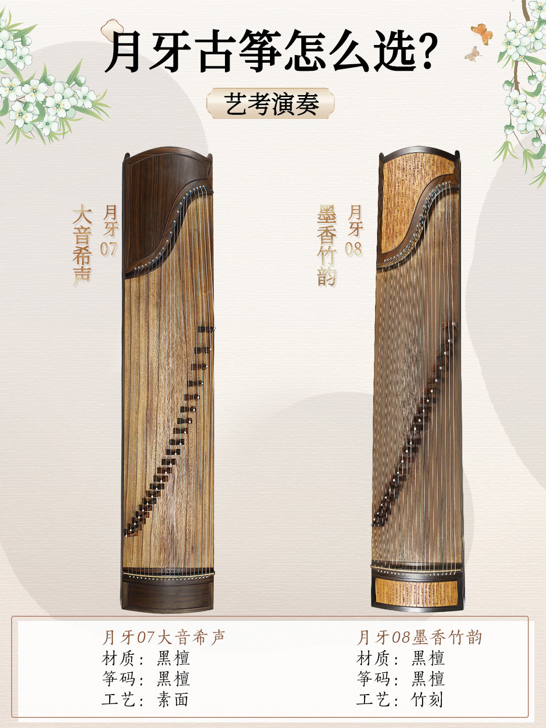 高端演奏筝,艺考利器。稀有的竹刻工艺,书香气浓郁。它的音色浑厚悠扬,无论难度多高的曲目,只要你有能力弹出来,月牙08都能近乎完美的呈现。