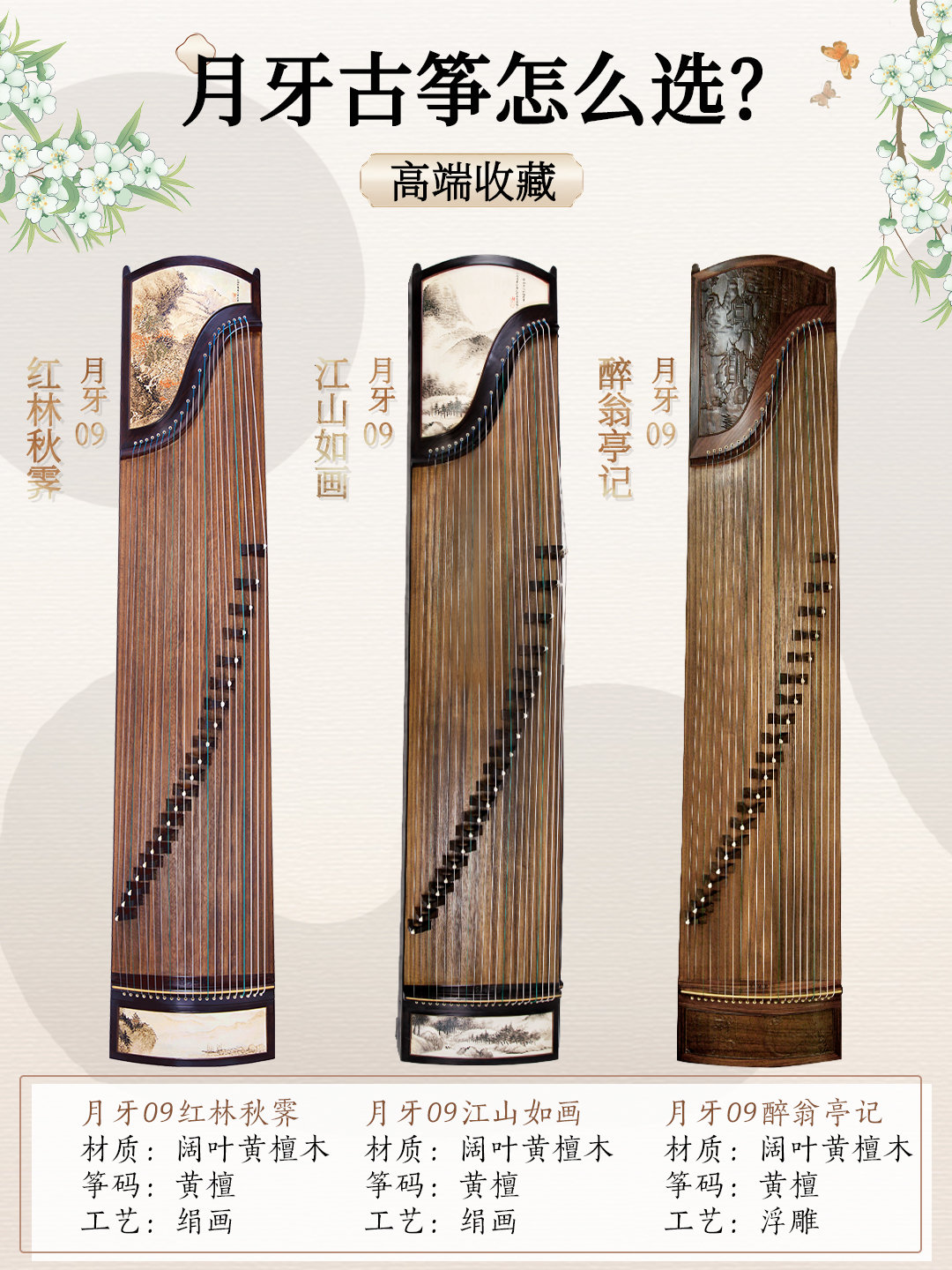 月牙09系列是高端收藏级别的古筝,这个系列有三款图案:红林秋霁、江山如画、醉翁亭记,古典韵味十足,每一架拿出来在古筝界都出类拔萃。主材选用的是木中贵族黄檀木,足以彰显它的收藏价值。