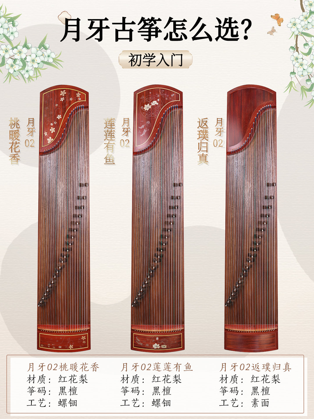 定位是初学演奏筝,这个系列有3款图案可选:桃暖花香、莲莲有鱼、素面。月牙02对新手来说无论是价格还是使用感都很友好,初学需求都能够满足,也是业余爱好者的经济初学筝首选。