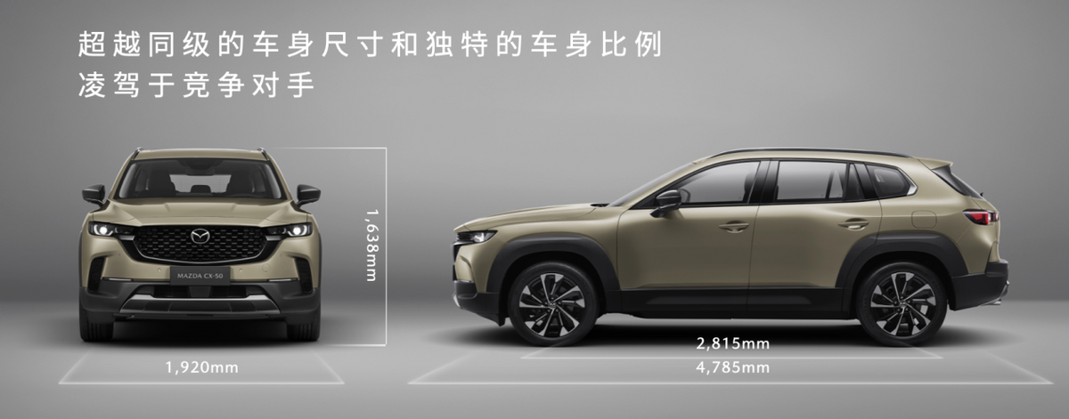 设计方面,MAZDA CX-50以“VIBRANT UTILITY(活力·实用)”作为全新的「魂动」设计主题,将SUV的强劲刚毅品格与「魂动」设计的野性、优雅融为一体,既满足了越野需求,又不失精致感。横向大宽度的车身骨架、强劲的块状格栅、标志性的黑色侧翼、细长的半圆形车灯、粗壮有力的宽体轮眉等,散发出强烈的户外气质。而(长)4,785mm*(宽)1,920mm*(高)1,638mm*(轴距)2,815mm的绝对尺寸优势,确保MAZDA CX-50能够在任何背景下都能彰显出无可匹敌的存在感。