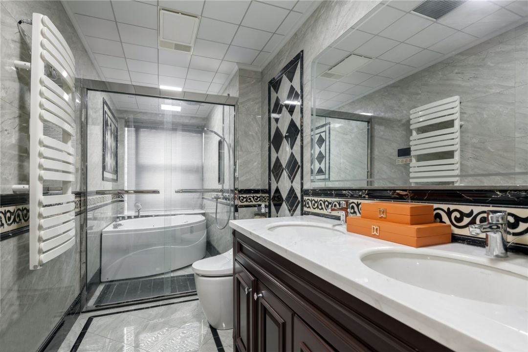 卫生间以黑白灰为基调,深色柜子与浅色台面的结合,加以局部欧式线条的勾勒,优雅不失情调。