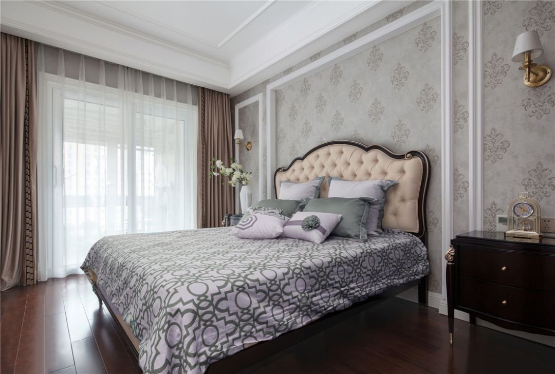 次卧墙面用木饰面做装饰,浅色花纹也使空间更有层次变化,选用较为简约的床品突出平实的生活理念。