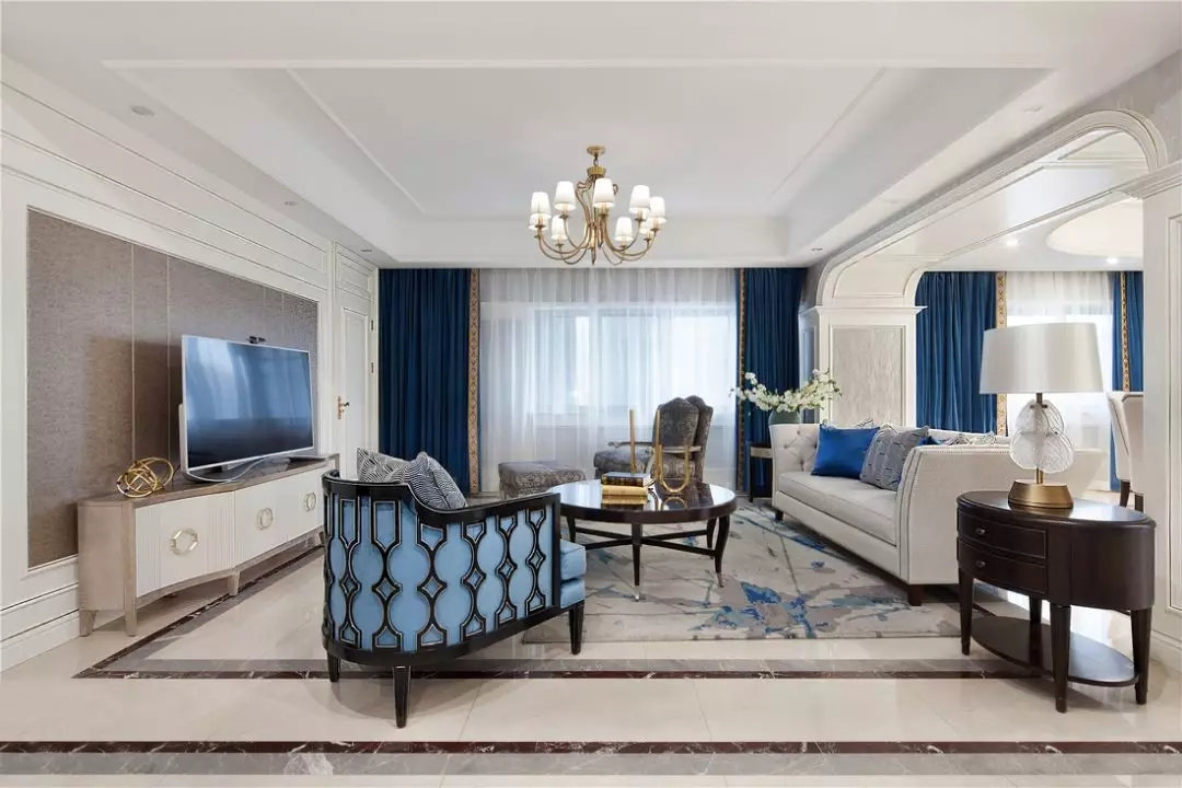 软装配饰的选择使整个空间欧式情怀浓郁,黑白,蓝色,咖色的色彩搭配则让客厅区域增添一份活泼与悦动。