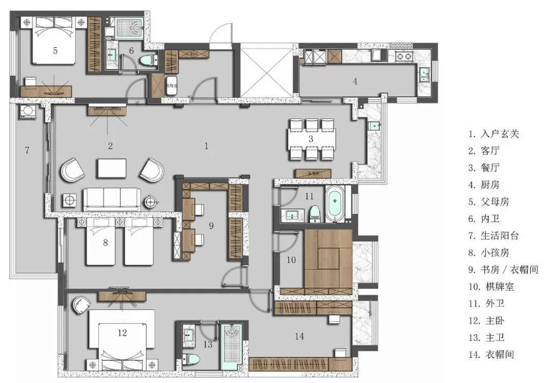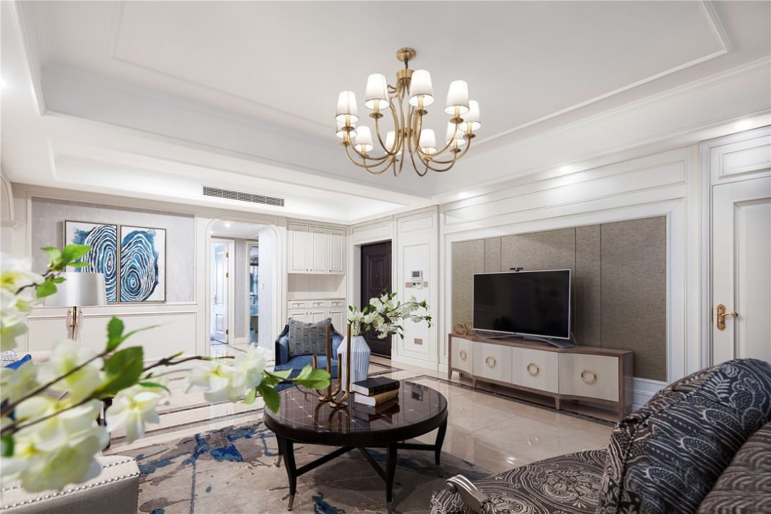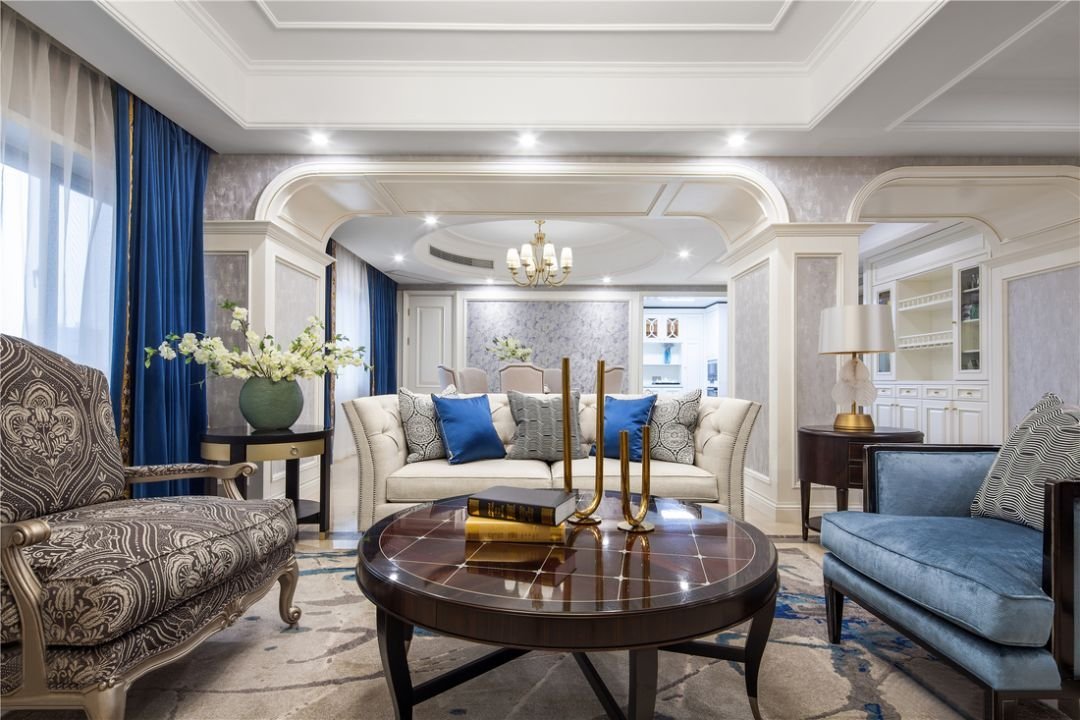客厅区域设计师运用木饰面与硬包结合,从色彩和形态上丰富了空间层次感,欧式的奢华格调也更为突出。
