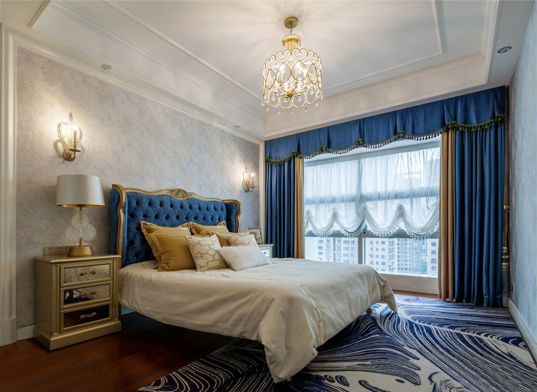 主卧选了一张蓝色宫廷风大床,更吻合空间主人的格调,衬托出古典家具的高贵与优雅。