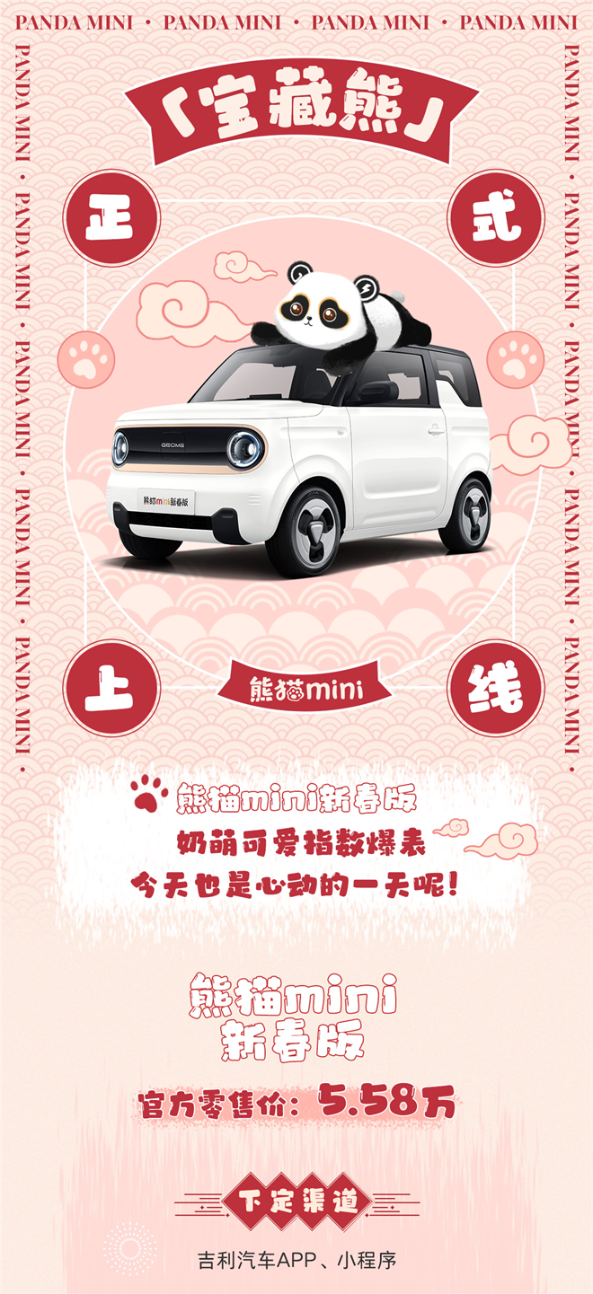 元旦将至,此前在线上人气高涨的“萌系纯电新物种”——吉利熊猫mini也在广州车展上“盛装出席”,并推出新年礼物“熊猫mini新春版”——宝藏熊,只需5.58万元即可成为“萌宠饲养员”。