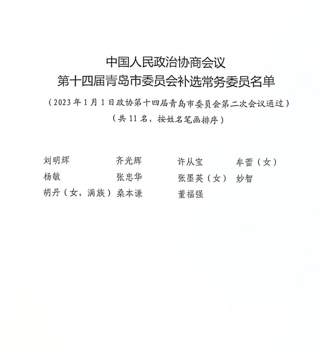 原标题:中国人民政治协商会议第十四届青岛市委员会补选常务委员名单