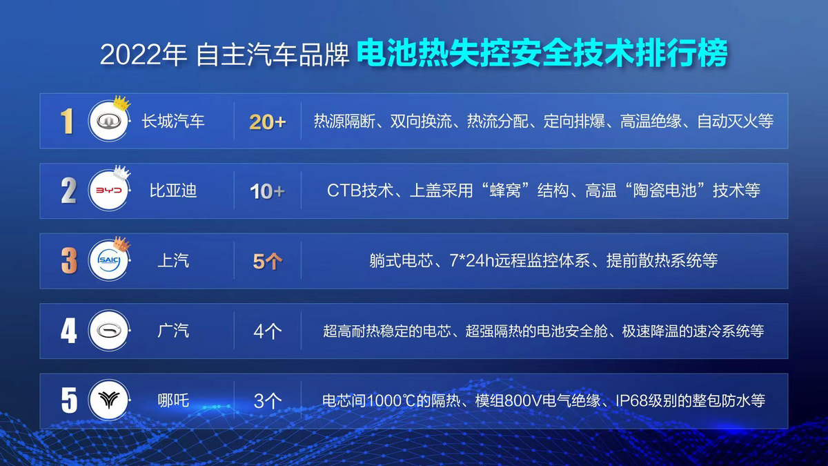 新鲜出炉的三大电池领域榜单,揭晓了这一垂直细分领域的终极大boss——长城汽车。近期公布的2022年自主汽车品牌动力电池种类排行榜、电池热失控安全技术排行榜、自主品牌电池续航能力排行榜中,登上TOP1的都是长城汽车。显然,在动力电池领域,无论是品牌效应、安全技术还是续航能力等用户关心的三大指标,长城汽车都已经从自主品牌中脱颖而出,力压宁德时代、比亚迪等电池企业,成为行业标杆般的存在。