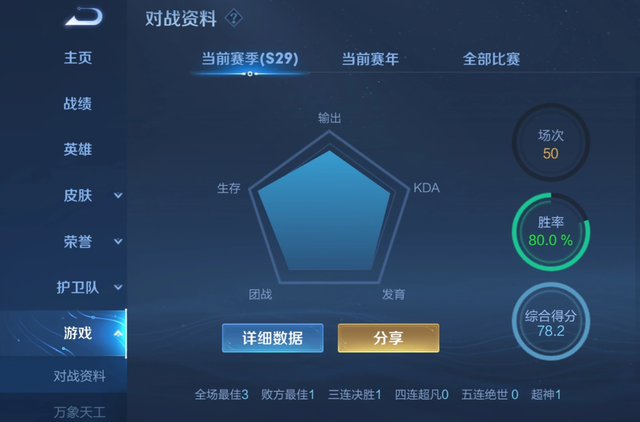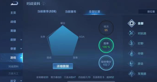 评分如果在90分以上,这类玩家属于小代水平,亦或者是高手去低端局炸鱼的水平。这类玩家胜率比较高,基本上每一把都能拿到MVP,这也是维持高评分的关键。这类玩家想要拿一个英雄国服并不难,但到了高端局就很难维持在90评分以上,大概率会掉到80分上下。超过100分的玩家凤毛麟角,但有一个大主播能达到这种水平,他就是骚白,他的最高评分高达102.7分,95场游戏,百分百的胜率,全场最佳53次,超神52次,三杀四杀都是常事。