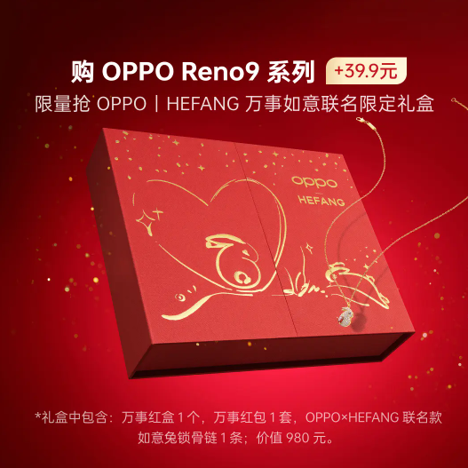 39.9 元换 980 元?OPPO | HEFANG 万事如意联名限定礼盒有点吸引啊,大家只要在购买OPPO Reno9系列的时候加 39.9 元即可抢购,12月29日起每日限量抢,购完即止,这个礼盒里面包括有万事红盒1个、万事红包一套,还有 OPPO×HEFANG 联名款如意兔锁骨链1条,感觉真的很超值啊,各位买OPPO Reno9系列的朋友记得加购。
