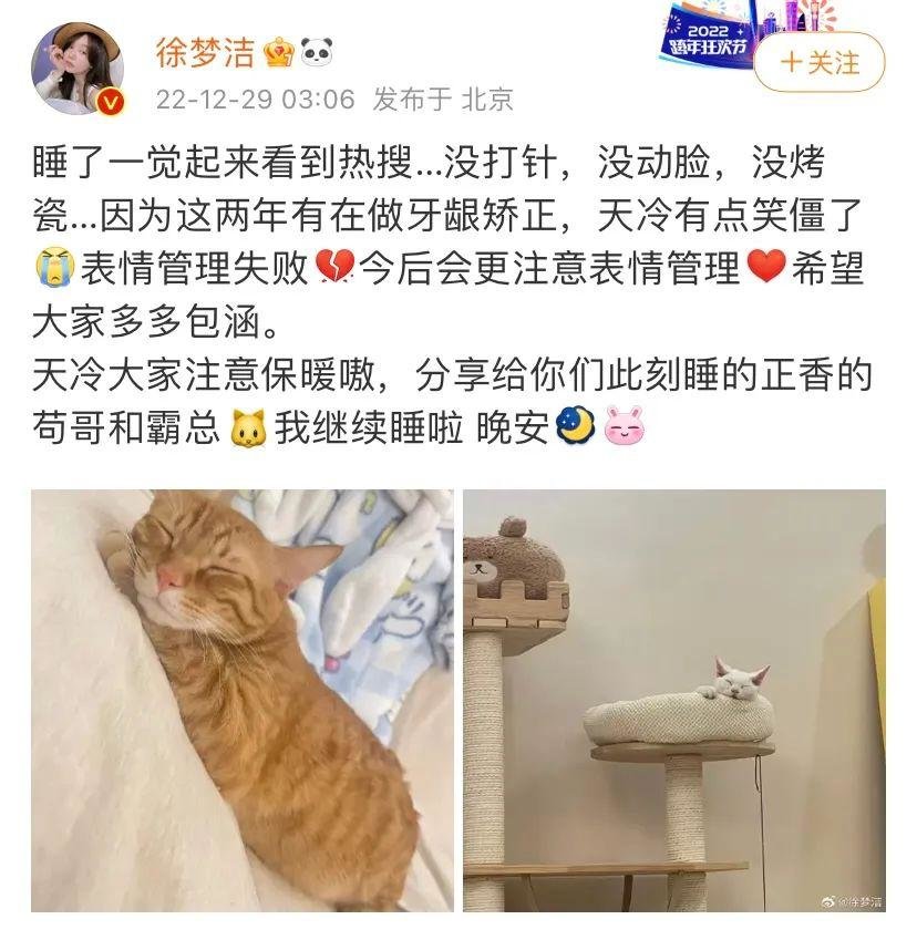 而对于整容以及做烤瓷牙的质疑,徐梦洁也第一时间进行了回应:没打针、没动脸、没烤瓷牙。这两年有做牙龈矫正,因为天冷所以表情管理失败了。