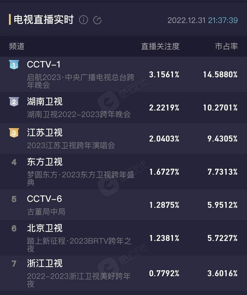 阵容华丽的东方卫视以1.2%位居收视第四,北京卫视以0.6%位居第五,而浙江卫视以0.5%垫底。