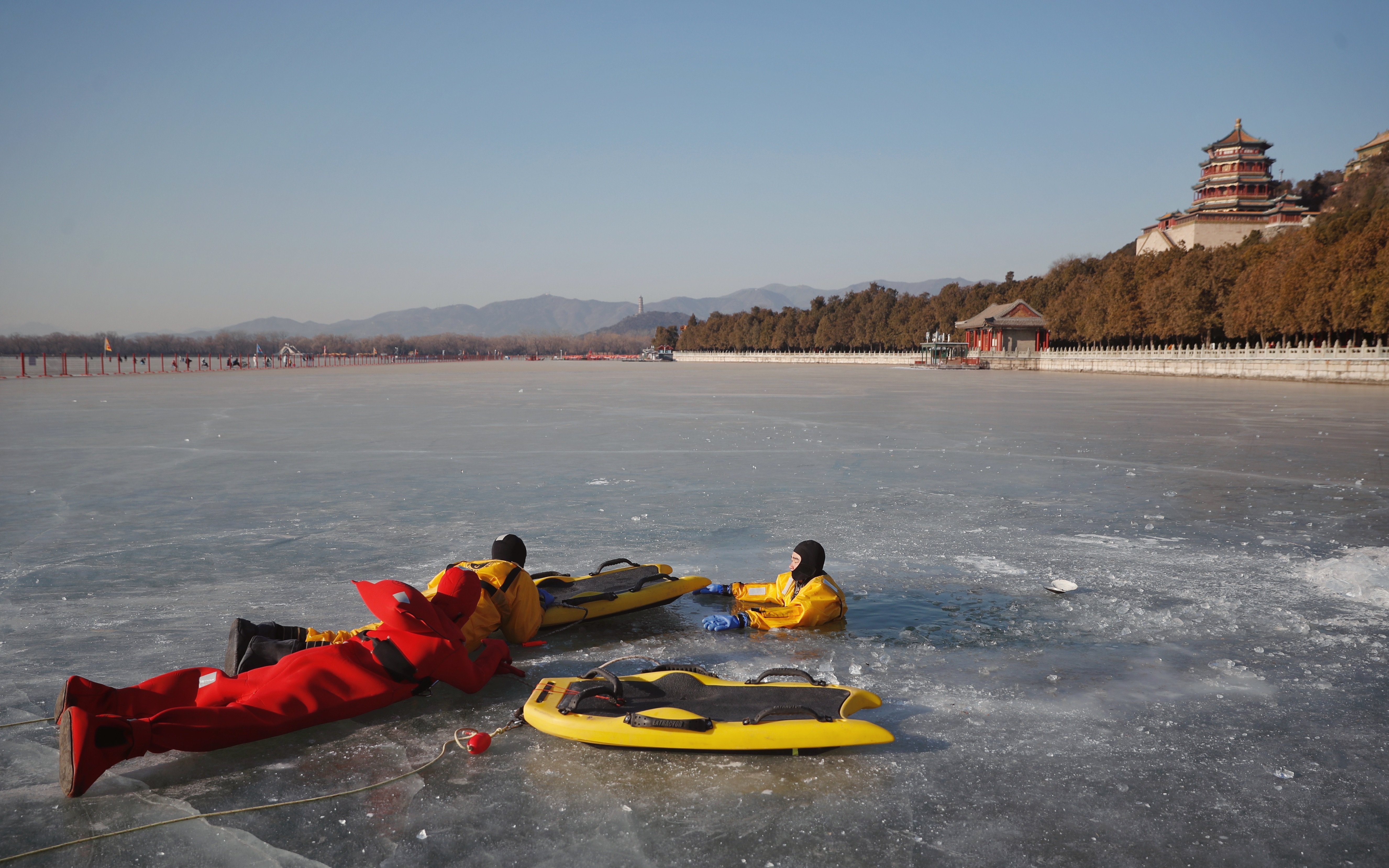 昆明湖冰场举行冰上救生演练。新京报记者 薛珺 摄