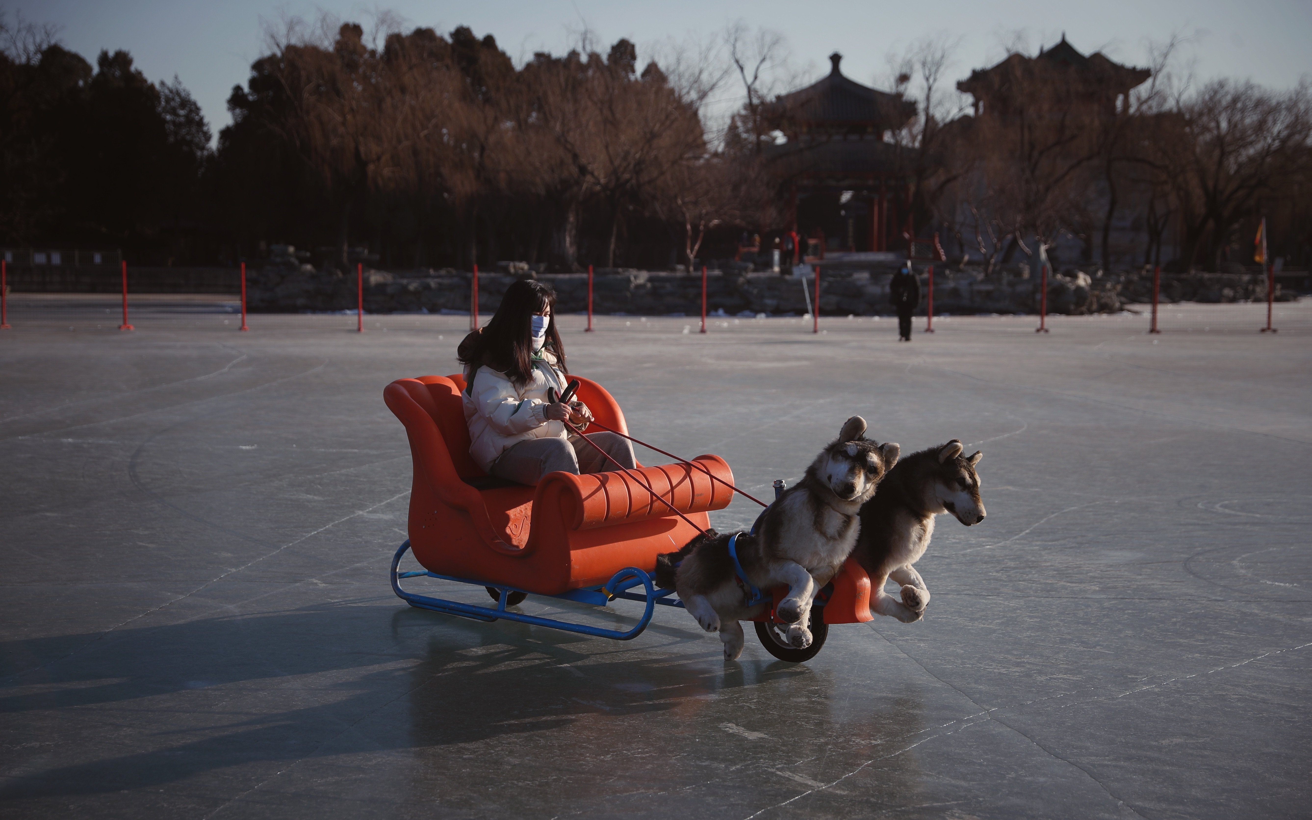 颐和园昆明湖冰场,游客在体验“电动狗拉雪橇”。新京报记者 薛珺 摄