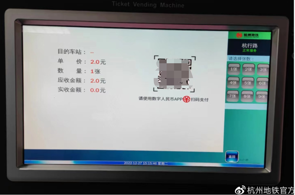 杭州地铁通过与交通银行合作,成功完成对车站终端设备的升级改造。只需下载注册数字人民币 App 并开通数字人民币钱包后,乘客即可在自动售票机上或客服中心使用数字人民币支付。