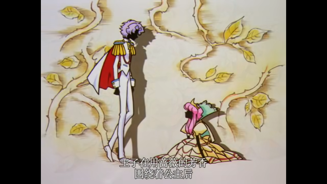 这时一名王子宽慰了她,吻去她眼角的泪痕,给她戴上一枚蔷薇戒指。