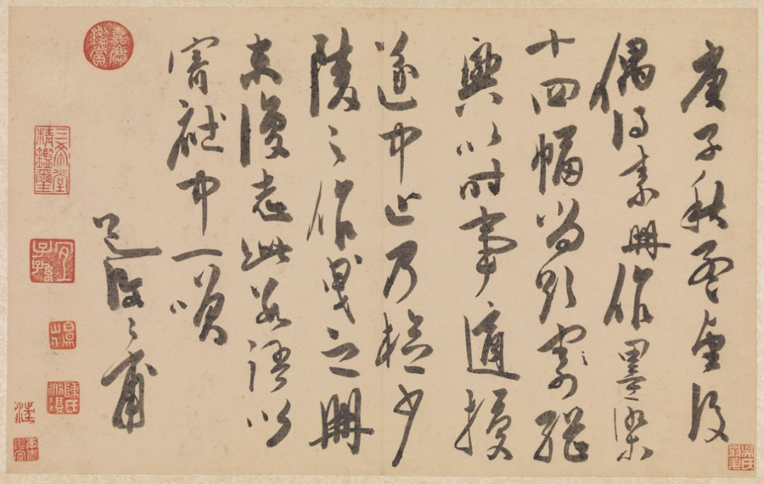 庚子(公元一五四0年)秋孟望後。偶得素冊。作墨染十四幅。尚欲寄(寄字點去)繼興。以時事適擾。遂中止。乃檢少陵之作。曳之冊末。復志此數語。以寄社中一笑。道復復甫。