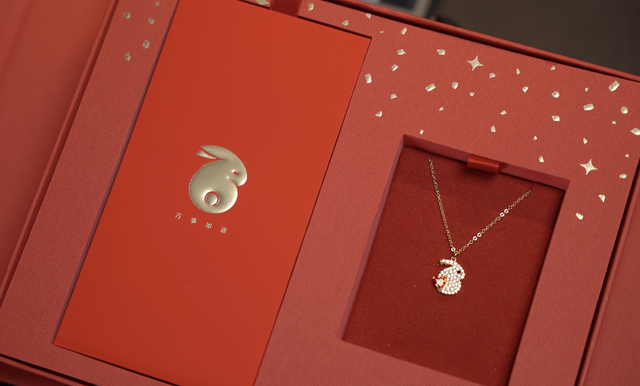 据悉,只要购买OPPO Reno9系列任意一款机型,然后加价39.9元就能抢这款价值980元的礼盒。里面内置了一整套万事红包,还有和何方珠宝合作定制的「如意兔」锁骨链。这款项链外形是可爱的兔子,兔子由高级珠宝特有的传统手工满镶锆石工艺制作而成,还有一颗心形红色锆石化作兔子的小尾巴,看上去十分精致。