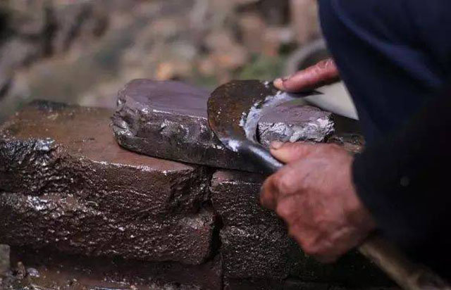 爷爷先是支起一块磨刀石,确保牢固后,再打一盆干净的水,一只手握着镰刀,另一只手五指并拢形成一个“勺子”,从水盆中“舀”一些水,洒在磨刀石上,然后舀水的手会紧捏镰刀的刀尖,开始在磨刀石上来回推动。一块原本四四方方的磨刀石,历经岁月的磨砺,形成了一个放大号的镰刀,两边高、中间低,刀刃走过,星星点点溅起的水花在阳光下发出耀眼的金光。