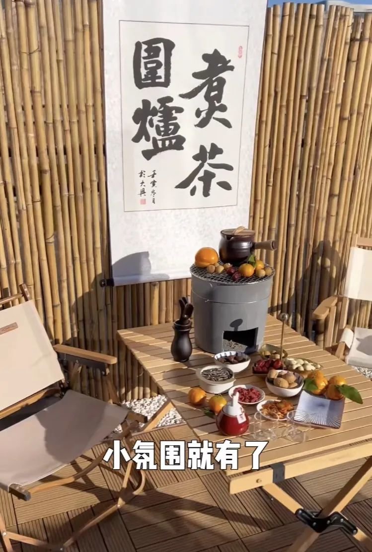 不少网友在自家小院或者客厅阳台支起一片人间烟火,打造“家庭版围炉煮茶”。