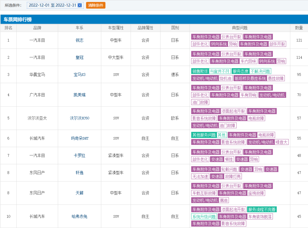 跨进2023年的第一天,12月份车型投诉排行榜也新鲜出炉,整体看投诉排行榜车型分类,8款车型为合资品牌,其中,丰田系共有4款车型入榜,成为12月份车型投诉的重点;自主品牌仅有长城汽车2款车型入榜,分别是玛奇朵DHT和哈弗赤兔,其中,哈弗赤兔漆面起泡开裂依然还是投诉的重点。