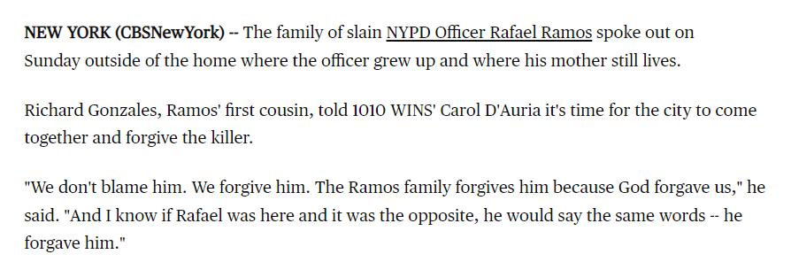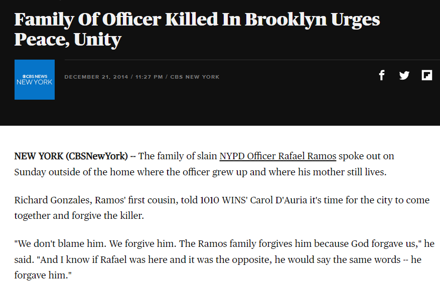 事件中被枪杀的警察拉斐尔·拉莫斯的13岁儿子在脸书上写了一句“可怕的是有人因为是警察而被杀,每个人都说他们自己讨厌警察”。而拉斐尔·拉莫斯的亲戚理查德·冈萨雷斯则表示,拉斐尔的家人已经原谅了布林斯利,并且呼吁民众也原谅布林斯利。