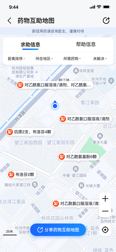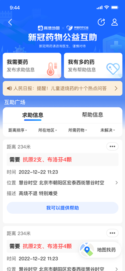 “我需要布洛芬混悬液”、“我需要抗原”、“我有乙酰氨基酚口服液”……如今全国各地的用户只要打开高德地图APP,在首页搜索“药物互助”,即可进入该公益平台,看到其他用户发布在互助广场上的药物求助和帮助信息,包括具体药品、发布时间、位置以及距离。
