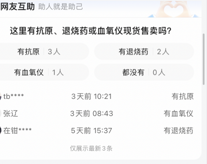 此外,为满足当前特殊情况下、部分用户的线下购药需求,高德地图还推出了“购药互助”功能,用户在高德地图APP上搜索药店查看时,可看到其他用户发布的相关互助信息,例如某家药店是否有抗原或退烧药现货,多久之前有用户反馈等。