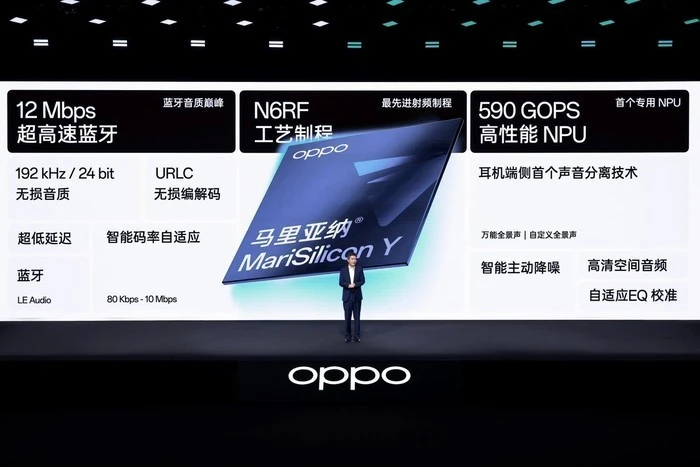 在前些日,OPPO又发布了旗下第二颗自研芯片马里亚纳 Y,这是一颗旗舰蓝牙音频SoC芯片,使用了全球最先进的N6RF工艺制程,拥有12Mbps蓝牙速率,首次实现了192kHz/24bit无损音频的无线传输,同时还首次集成专用NPU单元,高达590 GOPS的超前AI算力首次在耳机端实现了声音分离技术,带来更具个性化的聆听体验。