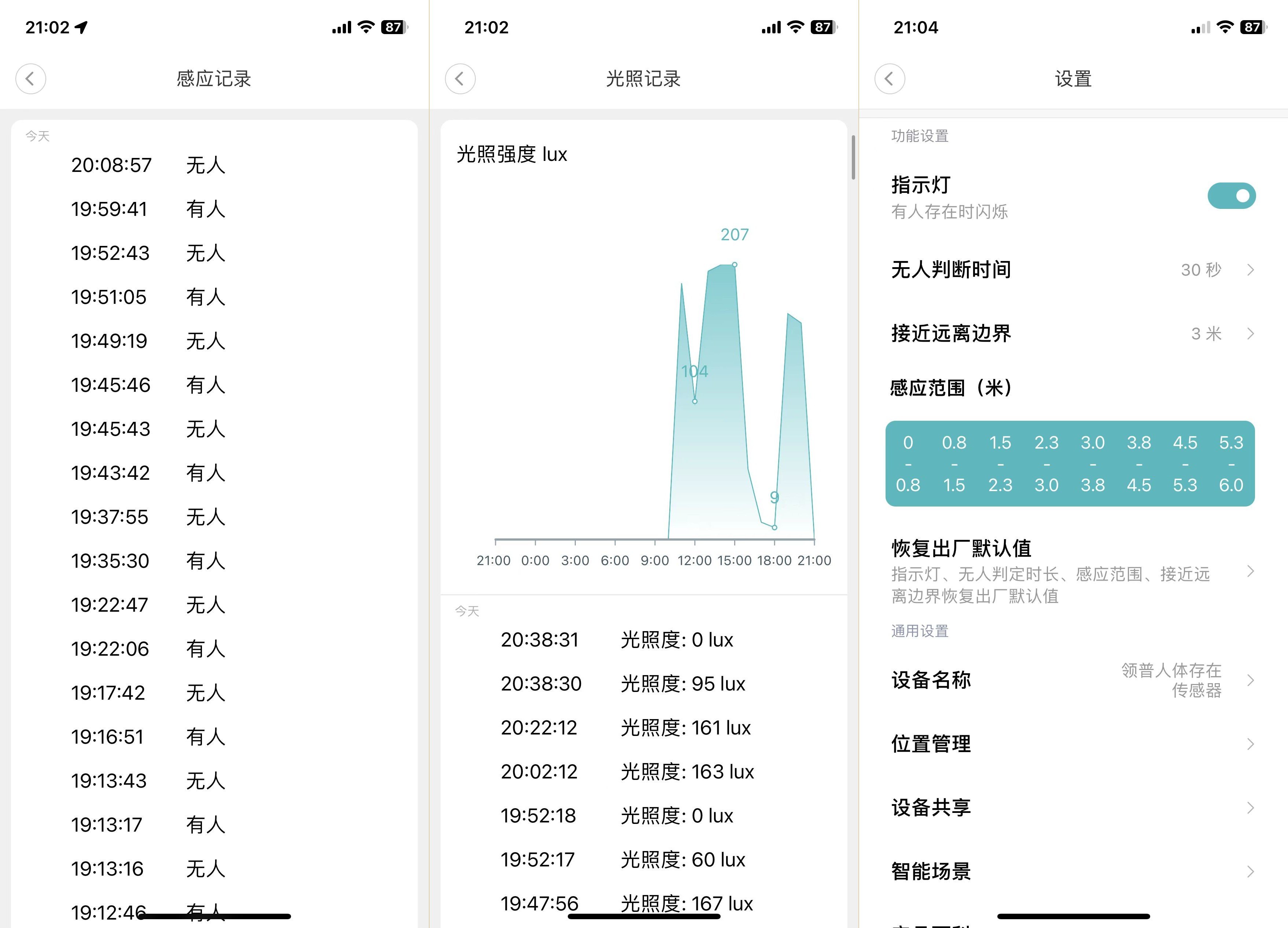 点击设备主界面中的感应记录和光照记录可以查看详细感知情况,特别是光照记录内还直观的展示了最近24小时的光照曲线,方便用户设置智能场景的光照值。另外在设置内可以自定义感应区间,减少传感器的误报。