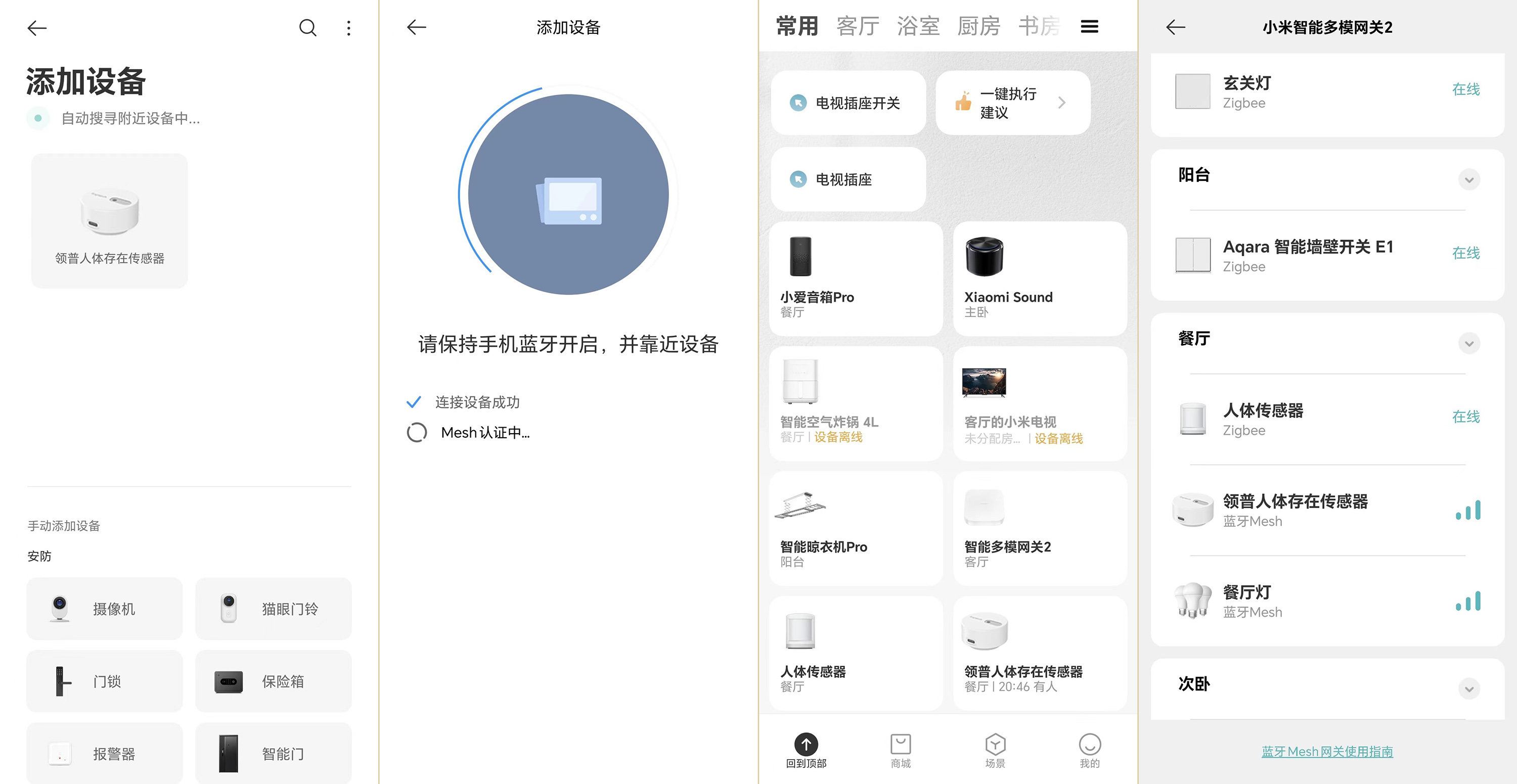 将领普人体存在传感器接通电源,打开米家APP的添加设备自动搜索并添加,添加成功后就出现在米家设备列表里面。领普人体存在传感器使用的是蓝牙Mesh通信协议组网,适配小爱音箱和小米智能多模网关等,并且支持场景本地化,即便家中断网了也能稳定联动。