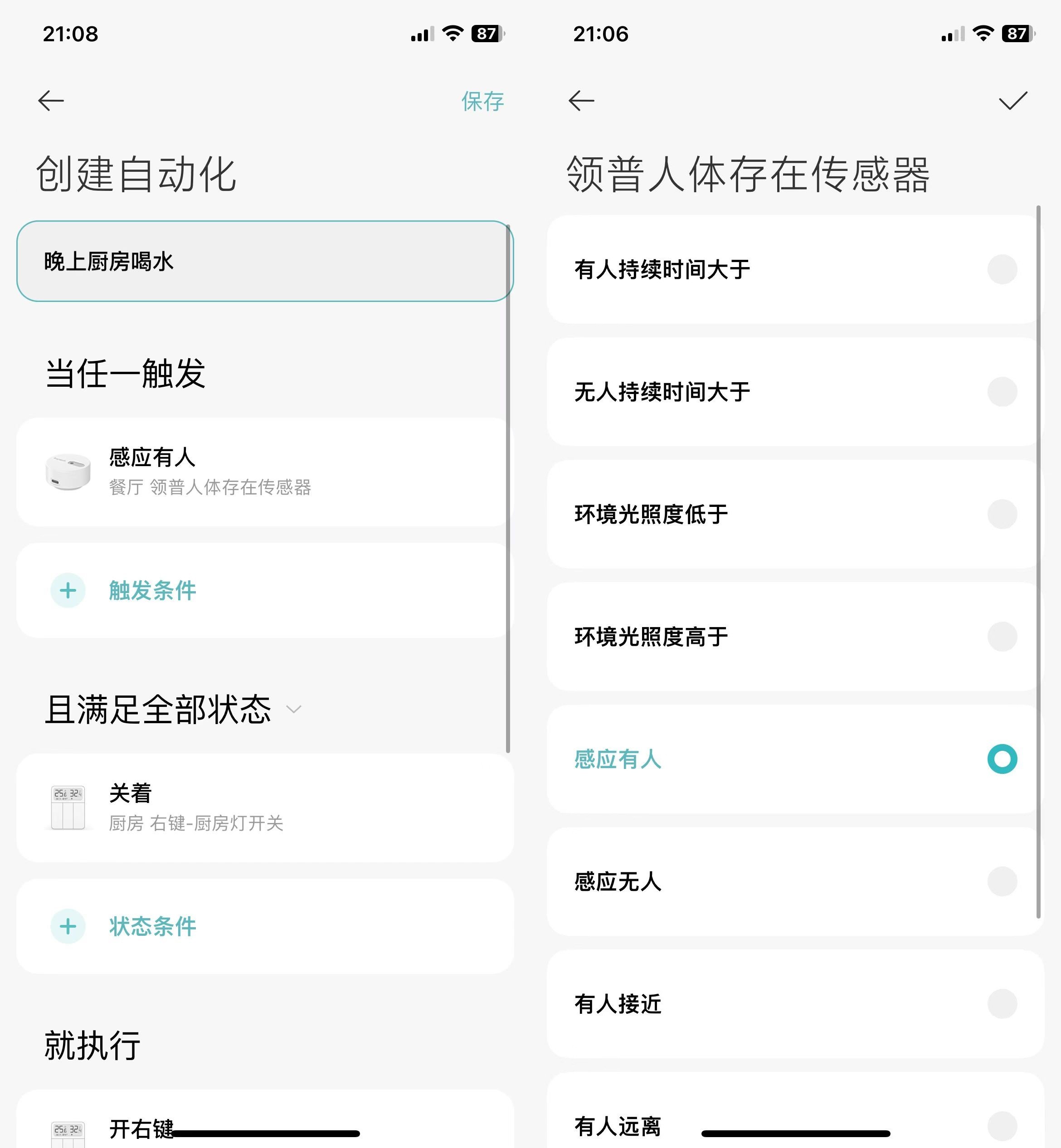 领普人体存在传感器中除了有、无人的基本条件外,还有接近、远离、有无人的持续时间和环境光照度等触发条件,有了这款领普人体存在传感器让米家的智能联动更加丰富实用。比如小孩接近窗户危险区域的警报、检测家中无人时关灯打开安防等。