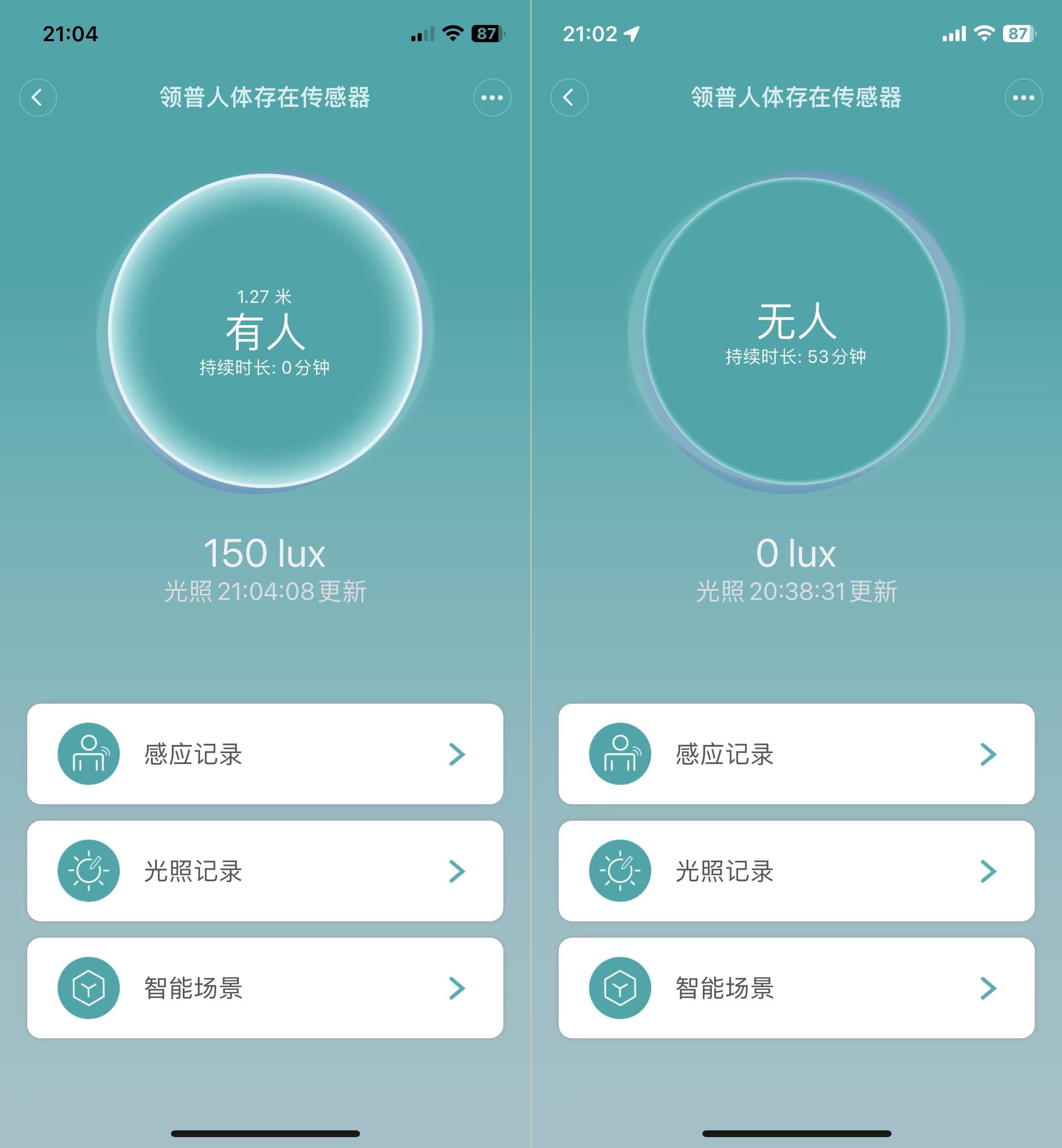 点击领普人体存在传感器进入设备主界面,可以看到上方显示了有无人、距离、持续时间和光照亮度等人物活动和环境数据。官方介绍它拥有径向60°6米感应距离、140° 5米感应距离、180° 3米感应距离的远距离大角度感应范围;还拥有0 -10000 lux的专业光照度识别范围,满足全天及不同场所光照情况。