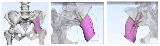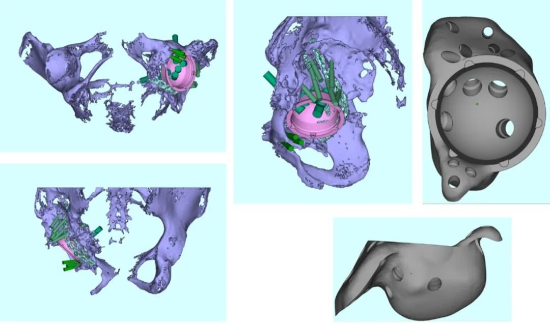赵德伟教授团队在仔细讨论病情并认真分析患者髋臼情况后,尹女士的关节可能是由于感染导致,决定按照尹女士的CT数据为其量身定制一款臼杯。从结构上既能通过填充骨缺损恢复股骨头旋转中心的位置,又能提供髂骨和耻骨桥接固定的一体化臼杯。在功能上还能利用3D打印的多孔结构搭载含抗生素,用于术后长期有效的发挥抗炎作用。假体是由伟坦(大连)生物有限公司与北京力达康有限公司共同设计制作。
