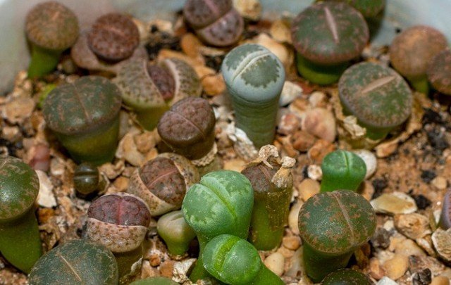 生石花,学名:Lithops N. E. Br.,是中央种子目番杏科生石花属全属植物的总称,约有40种,多年生肉质草本,几乎无茎,球状叶色彩多变,叶表皮较硬,色彩多变,顶部具有深色树枝状凹陷纹路,或花纹斑点,称作“视窗”。