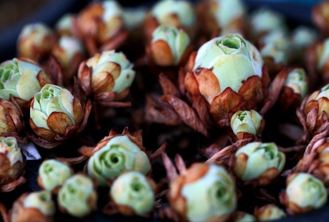 山地玫瑰进入生长期后原本“勾魂”的玫瑰花型会在几周内迅速展开,休眠期7月至8月,休眠期间外围叶子枯萎,中心叶片紧缩呈玫瑰花形,夏季通风、少水、遮光50%就能保持“勾魂”的状态。