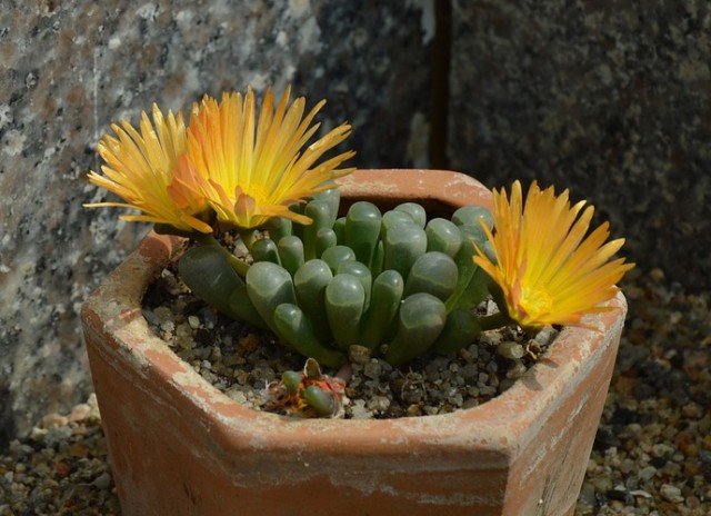 生石花顶部有一裂缝,到了花期裂缝中开花,花单生,雏菊状,花茎2-3厘米,花白或黄色,花期盛夏至中秋。