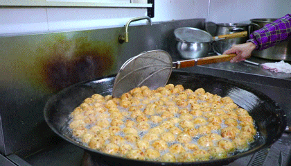 在很多武汉人心中,年味是从吃一口刚出锅的圆子开始的。圆子有藕圆子、肉圆子、鱼圆子、豆腐圆子等等,种类繁多,吃法也多种多样。从油锅里现炸出炉的圆子,金灿灿圆滚滚的,象征着团团圆圆,是武汉家庭年夜饭上必不可少的一道菜。