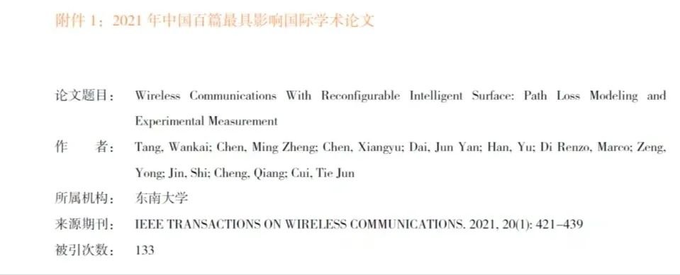 东南大学金石教授课题组与崔铁军院士、程强教授课题组共同发表于IEEE Transactions on Wireless Communications的论文“Wireless communications with reconfigurable intelligent surface: Path loss modeling and experimental measurement”入选2021年中国百篇最具影响国际学术论文。论文第一作者为东南大学青年教师唐万恺副研究员,合作者还包括戴俊彦副研究员、韩瑜副研究员、曾勇教授和巴黎萨克雷大学Marco Di Renzo教授等。
